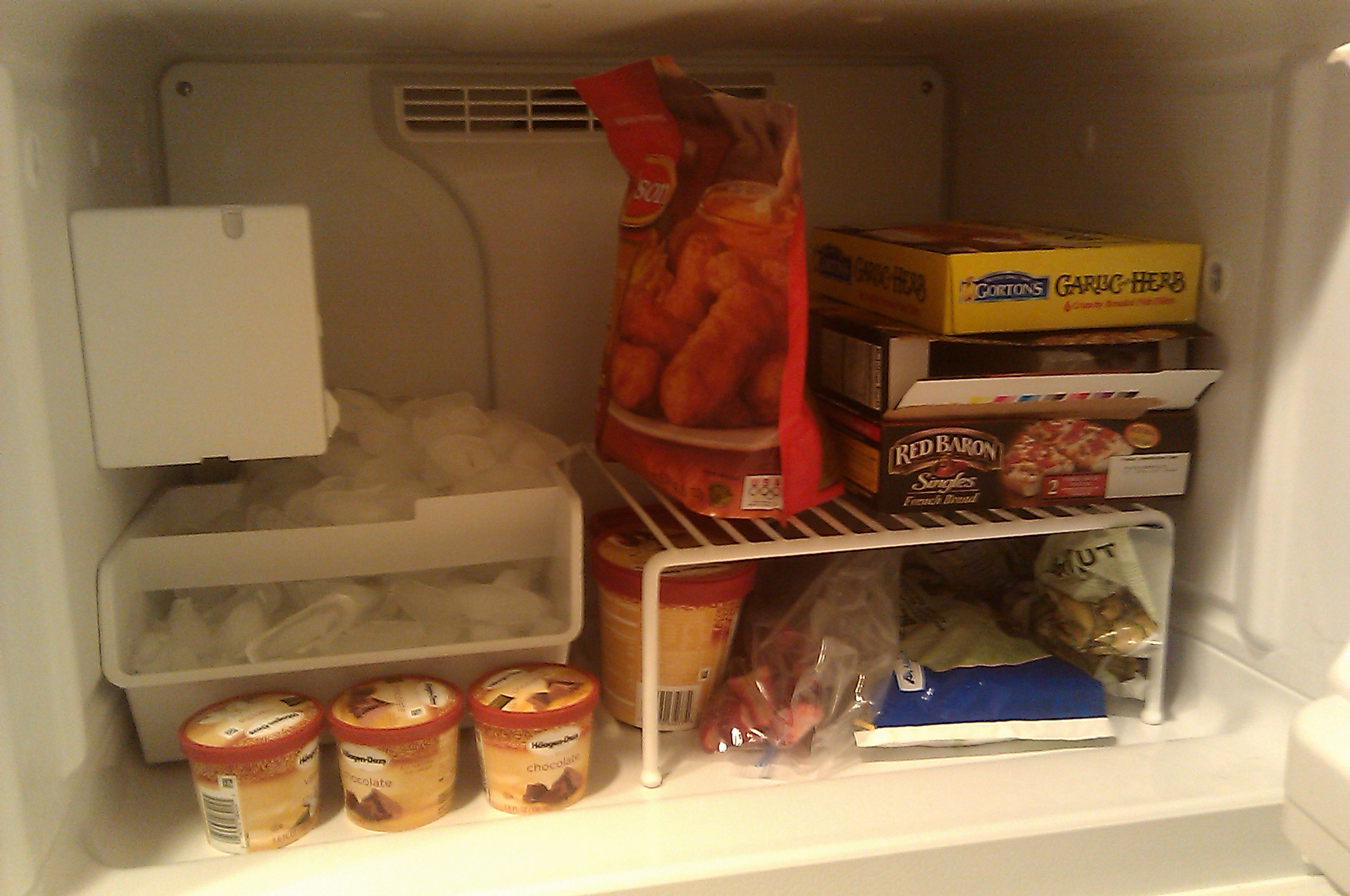 I previously mentioned that I live in an apartment. Well, apparently one of the previous tenants removed the shelf from my freezer – assuming it had one to begin with. When you have a big open space, trying to keep lots of little things in it in order can be a challenge. Here’s a simple solution, use a wire shelf designed to hold dishes in the cabinets – it’s sturdy and won’t wear out in the freezer. (I got mine at the Home Depot for less than $10 for a set of 2. You can also find them at the Container Store and, most likely, Walmart or Target.) Then you have 2 levels to keep things organized. If you have a self defrosting freezer (most people do) then you want to be sure to keep flat things flat and top-side up so that if things get a little soft not everything runs to the lid or one end of the container. So I stacked my frozen pizzas on top of the shelf, and put the less stackable bags of frozen veggies underneath it.