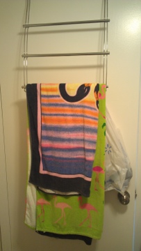 An over the door towel rack for hanging delicates (or in this case towels) to dry.